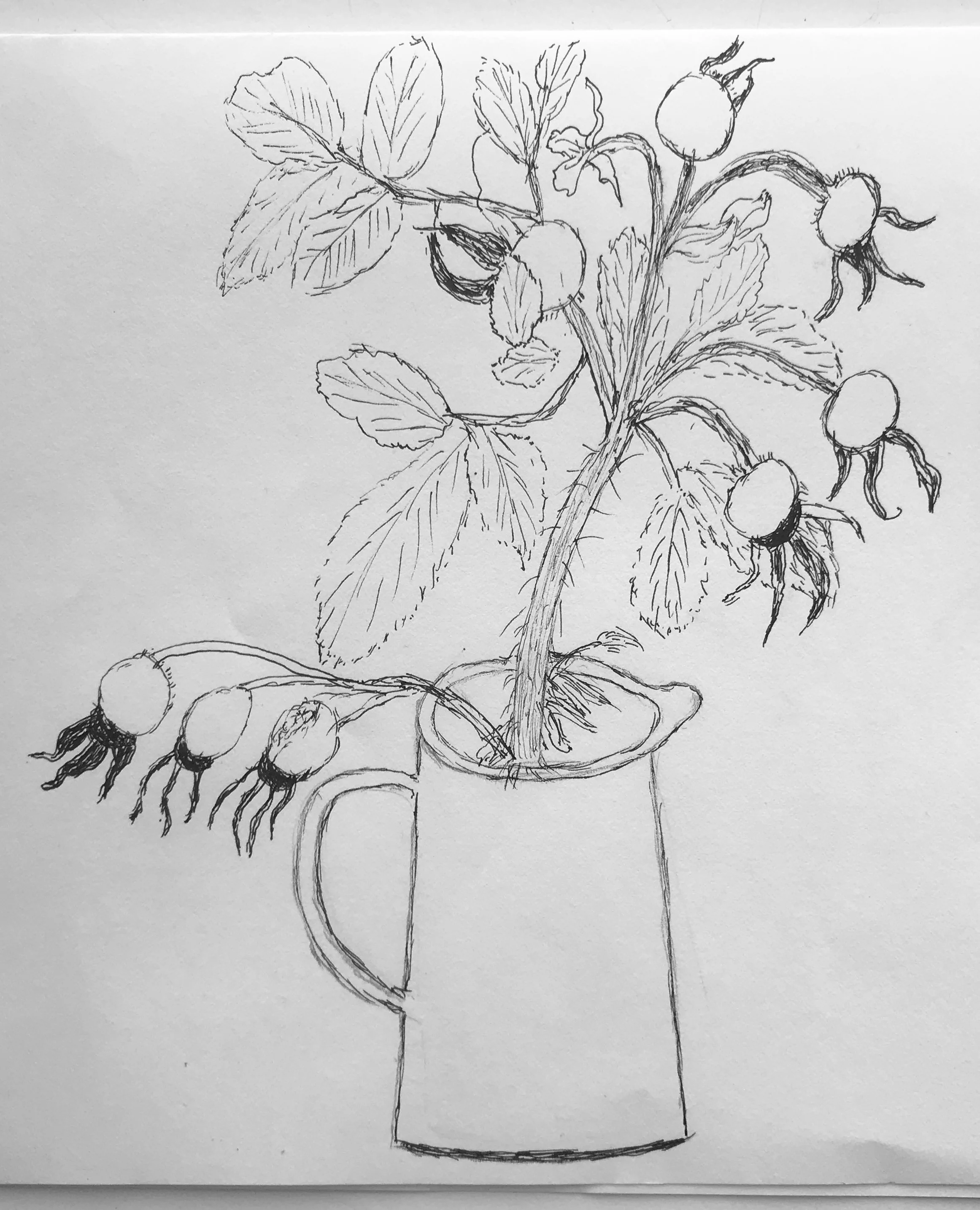 We have a pen drawing of some large, fat rose hips (more winter food for the birds), their differing shapes have been rendered with careful observation. We can imagine their shiny scarlet hues, and we can see the dried, brown sepals that seem to waving hello to us. The leaves have been studied and drawn with great care, their shapes and inner veins delicately rendered, with the rose hips overlapping, giving depth to the drawing. We can almost feel the prickly thorns piercing our skin. Ouch!