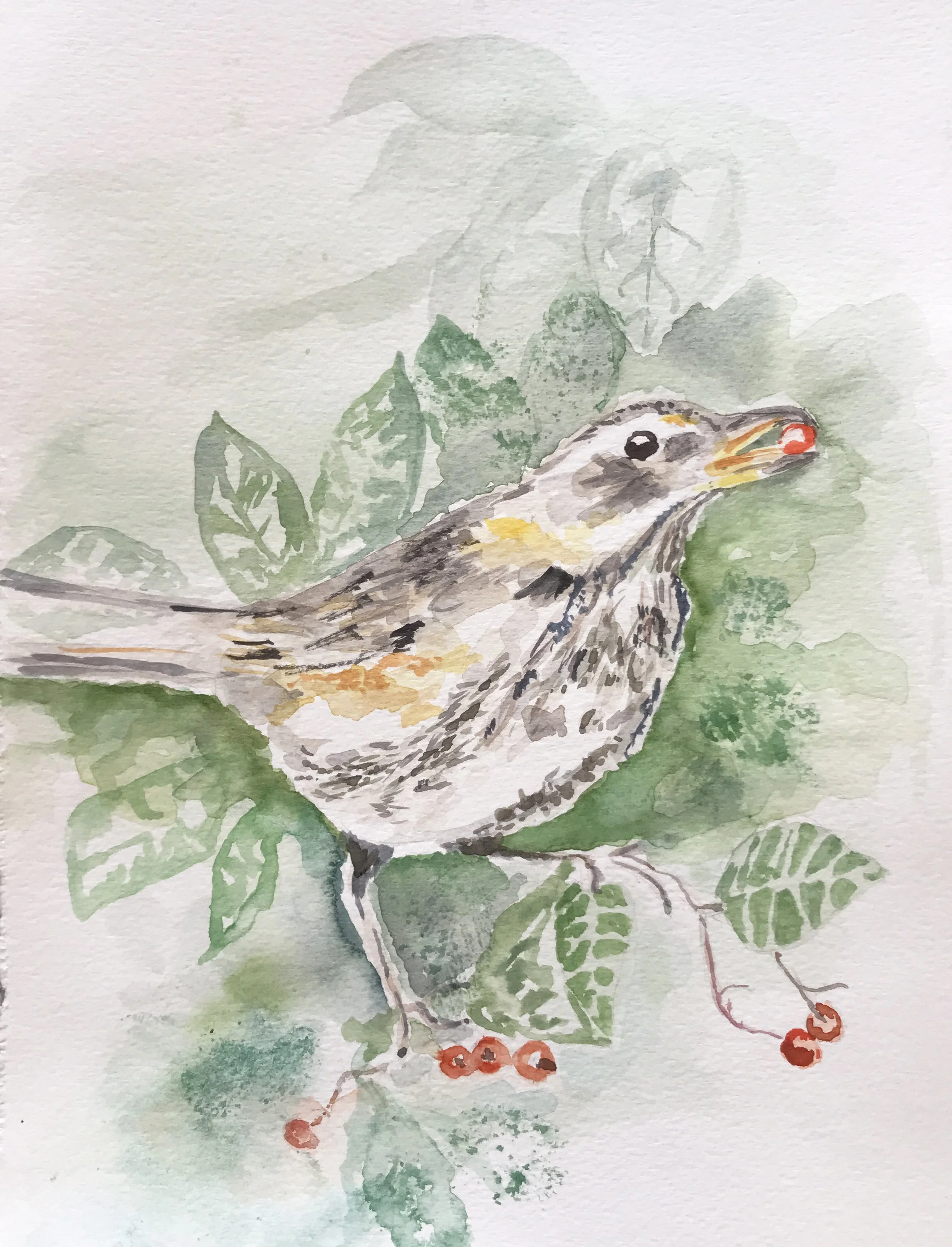We have a watercolour thrush, speckled with brown and flushed with golden yellows. It has a bright red berry in its mouth. The bird comes towards us showing us its beauty, and the leaves gently lighten and fade around the edges, leaving our imaginations to fill in the rest, maybe to even imagine this bird in our own garden. This is something we actually can all see in our gardens at the moment, the birds feeding, and it is uplifting to see them.