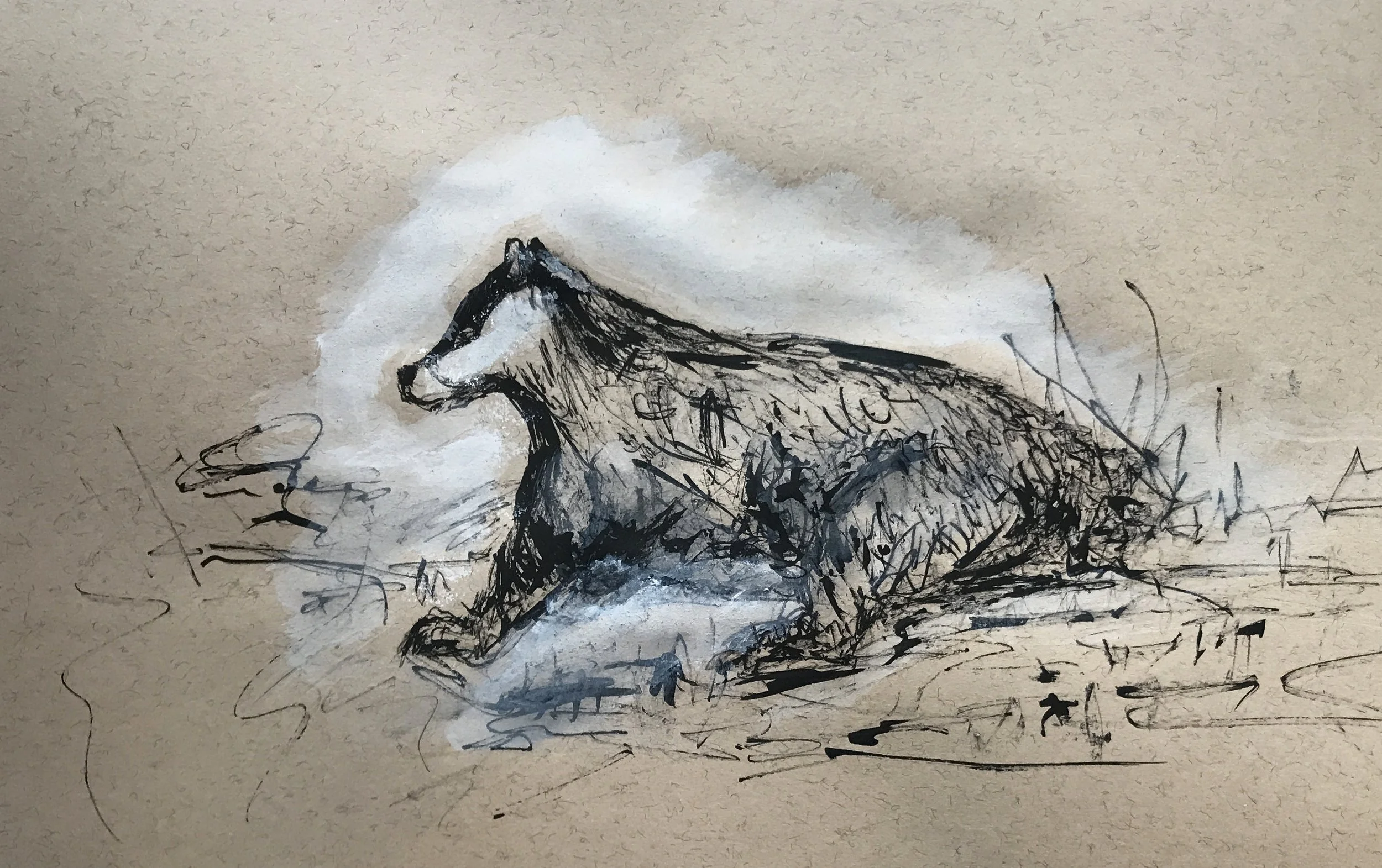 And we have a badger, drawn with stick, dip pen and white gouache and on brown paper. The stick and dip pen are perfect for portraying the bristly fur and winter grasses under the badger, with the white gouache adding highlights to the face and further winter foliage texture. We can almost sense the badger’s aliveness, its warmth, maybe even the sounds it is making. We can imagine the badger is under the tree in which the thrush is perched, and just along from the rose hip bush, filled with birds. We can also envisage the badger is getting a snug snoozing spot ready for a nice long warm winter sleep.