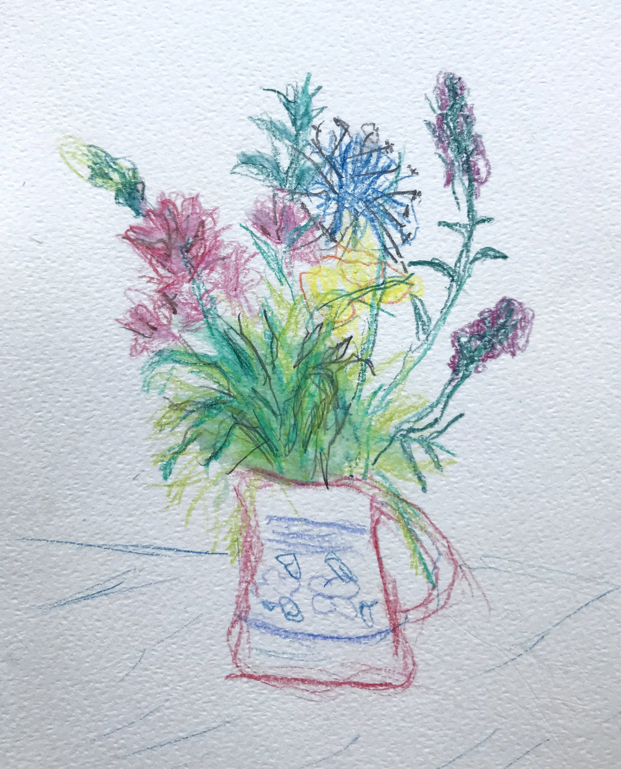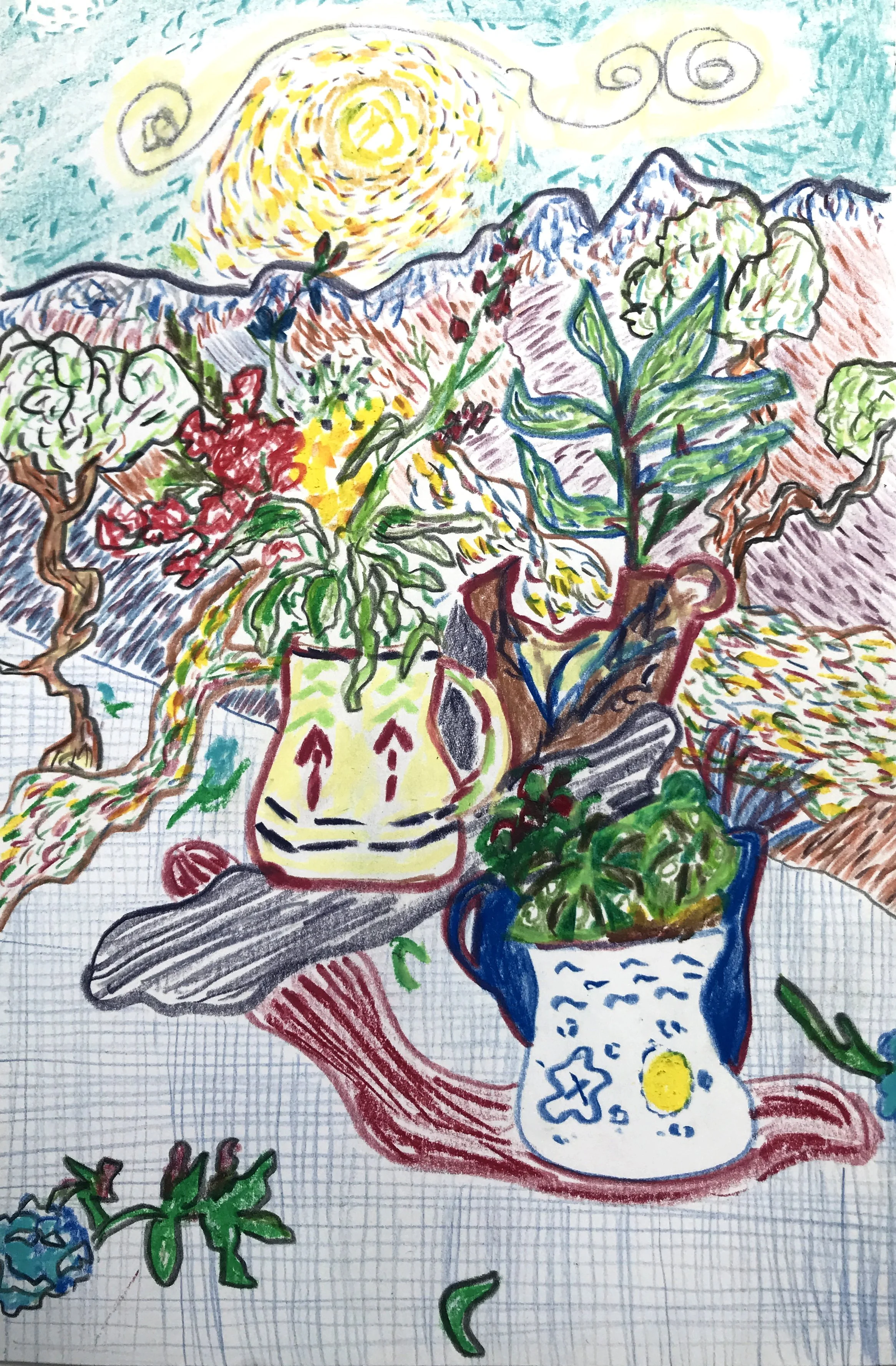 We have a variety of images today, all exploring many elements of picture making, including the use of: line, mark-making, shape, colour, light & shadow, and composition; as well as using observational looking skills and measuring methods; and application of media, such as how to obtain differing effects, and using mixed media on the same image.