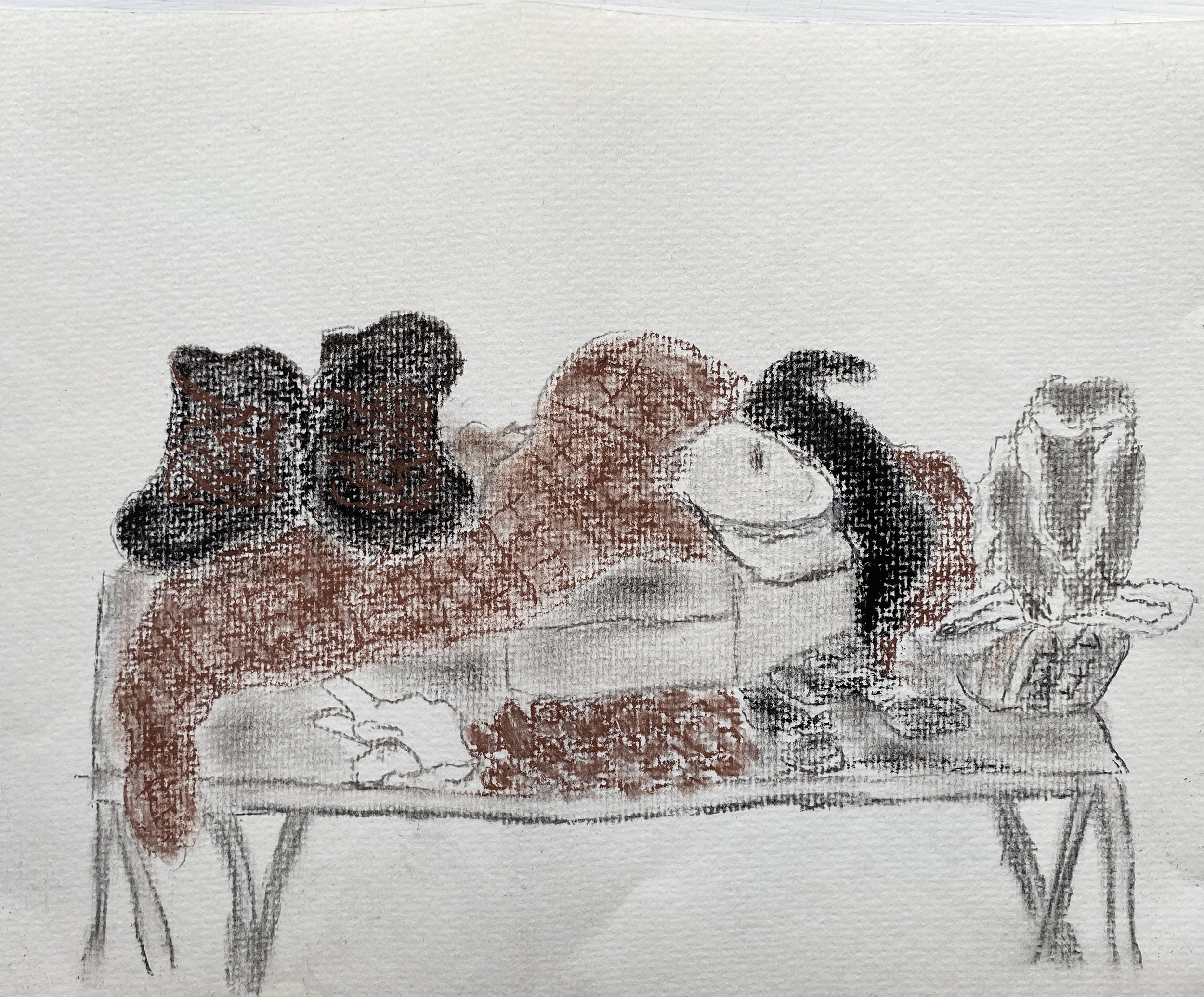 Today we created mid toned grounds on our paper from which to draw into with both plastic and putty erasers. We ascertained the light areas in the still life, and created those with our erasers, making some really interesting marks. We then worked back into the drawings with the charcoal, creating both depth and texture.