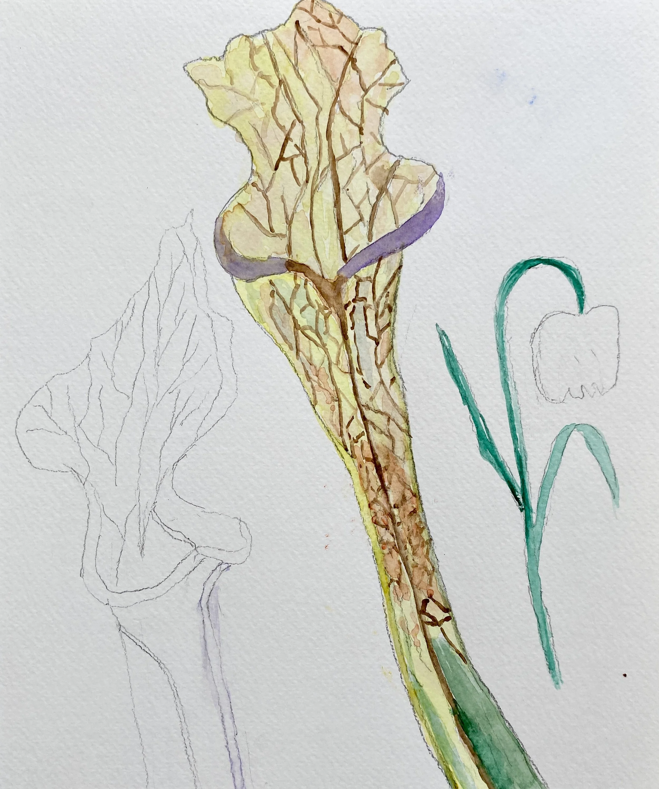 And then we have someone who did watercolour explorations from a live flower, as well as tackling one of Rosie Sanders watercolour artworks, creating a careful and beautiful study of one of her watercolour pitcher plants (from one of the books that I brought in).