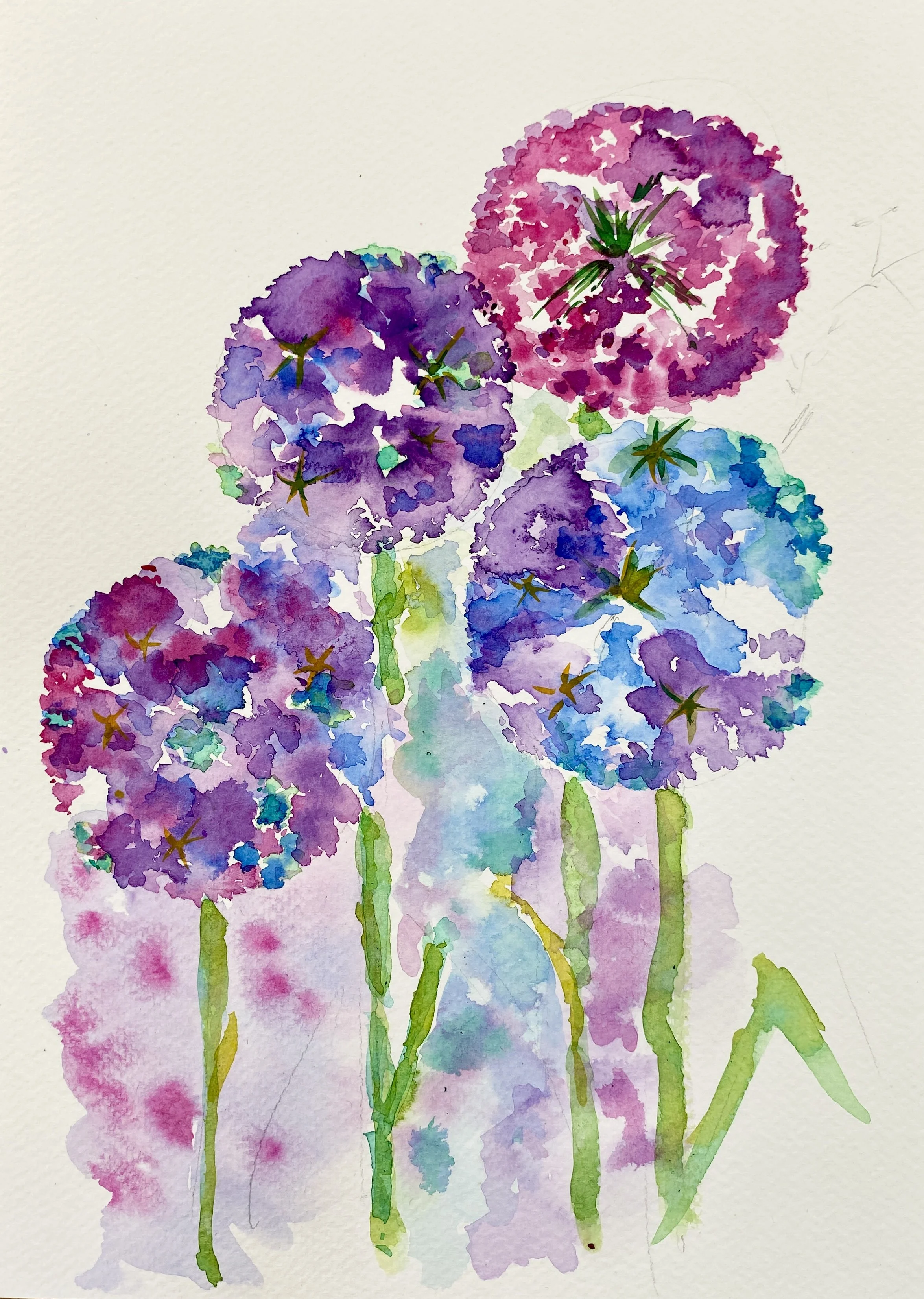 There was also experimentation with a set of new waterproof inks, using flower motifs to try out different techniques to see what results happen. Also glorious experimentation in colour with burnt orange wallflowers, using watercolour. Another image shows exploration of creating depth in very dark purple-brown hellebores, a challenge that is working really well.