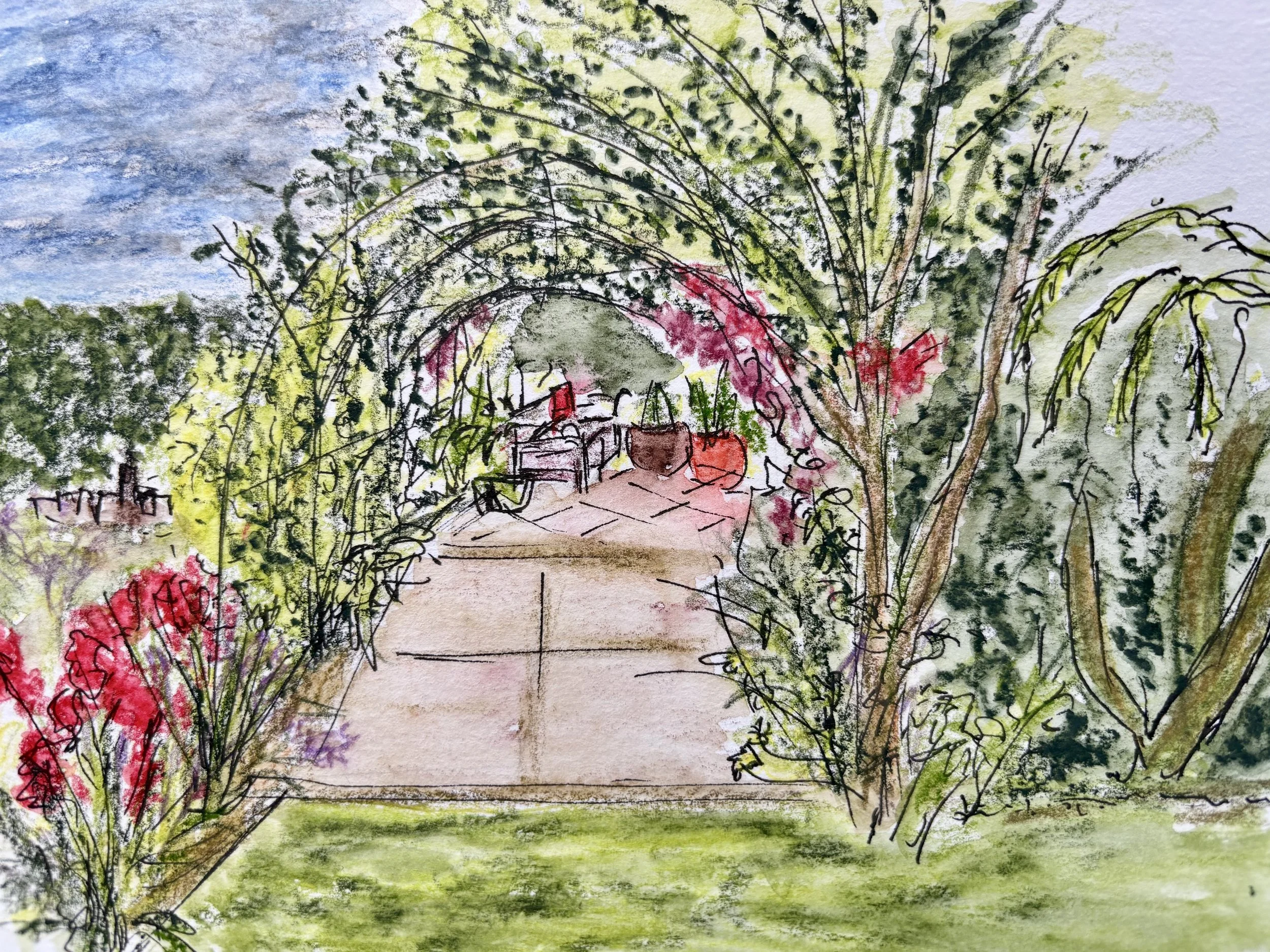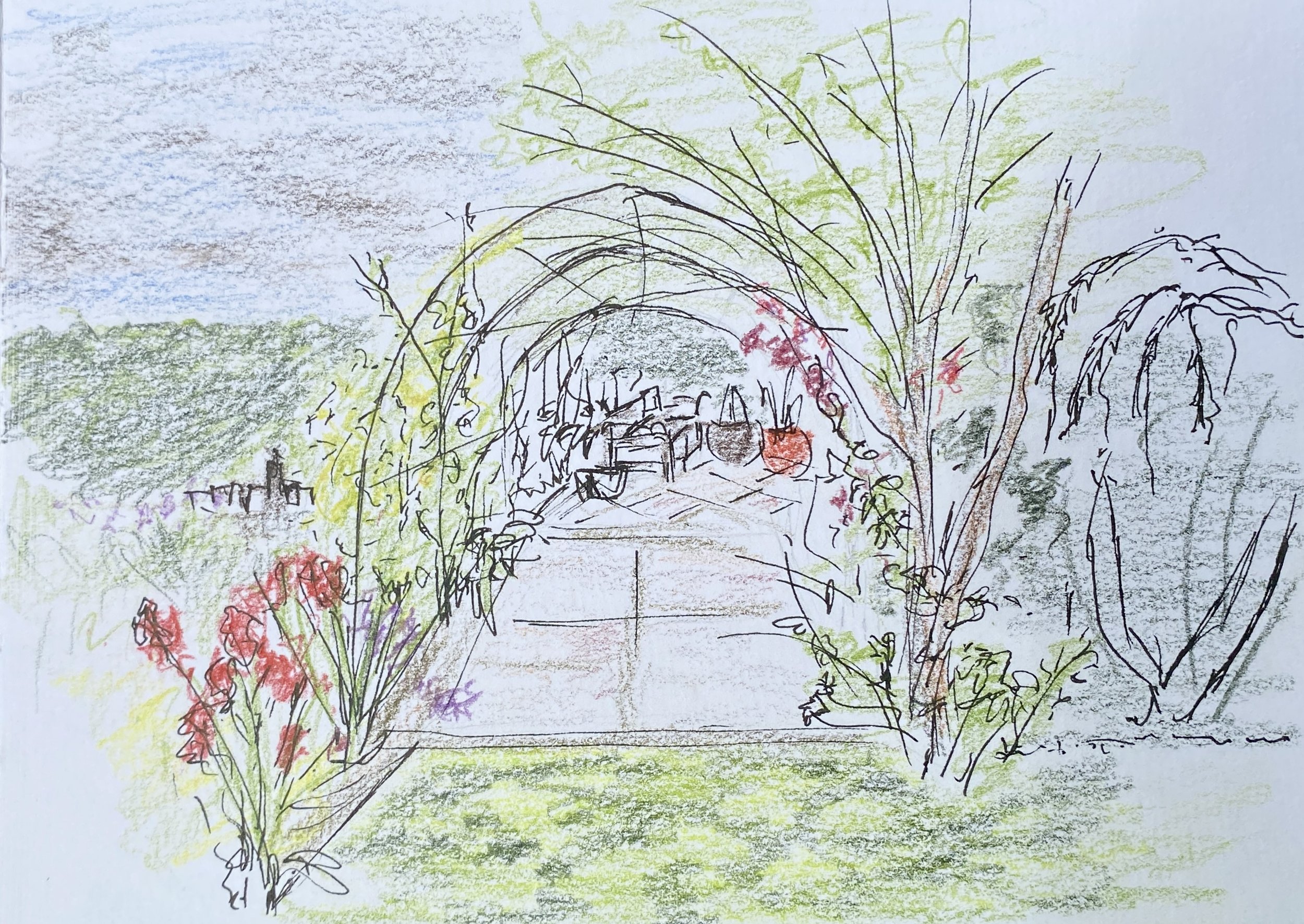 Our fourth year at Diane’s garden! A huge thank you to Diane for having us back again, we were made to feel so welcome. We had such a wonderful time, drawing, painting, and enjoying the “tranquility”. Thank you also to Alison and Linda B for being the best hosts, making much needed cups of tea, and for allowing us to traipse in and out of their lovely home to use the loo.